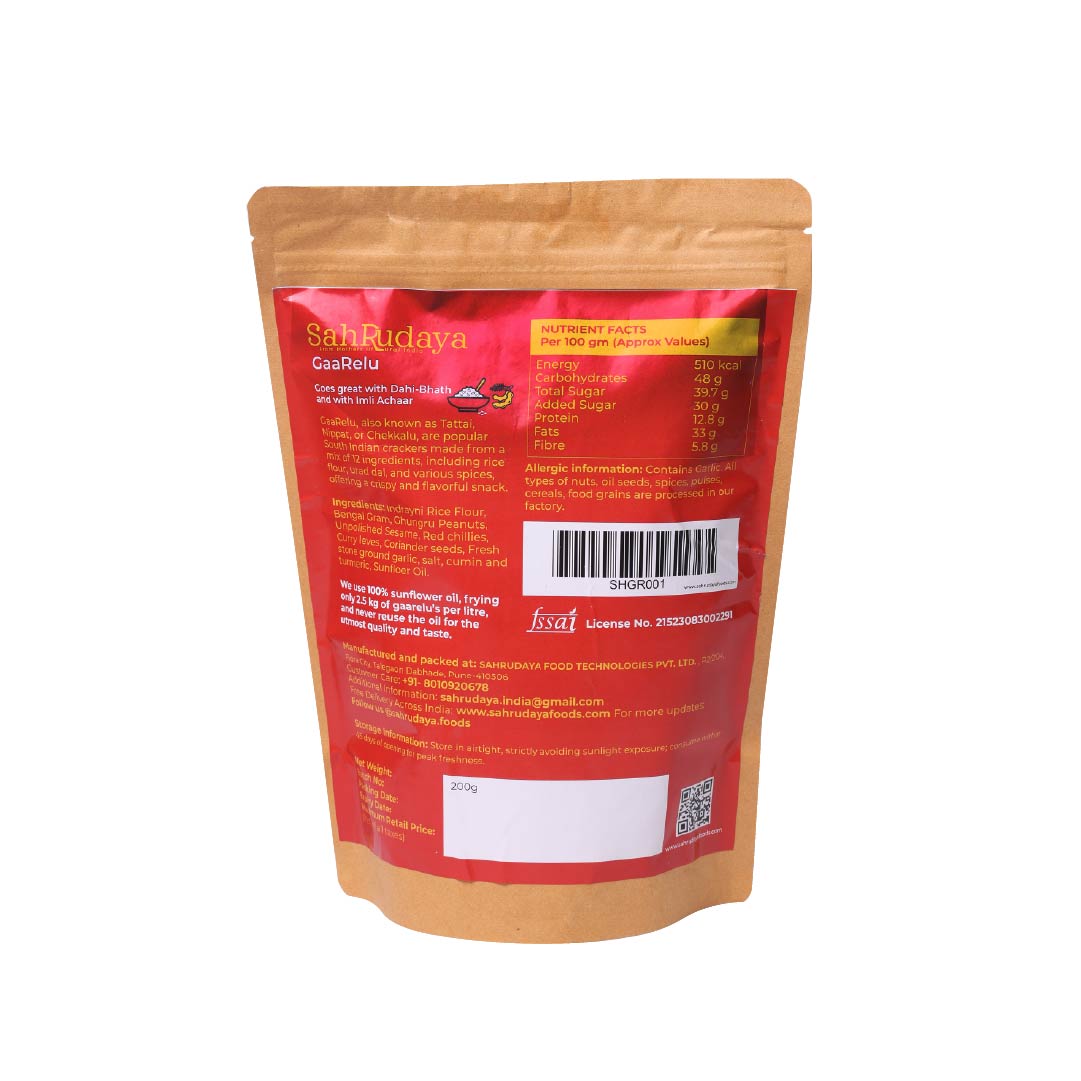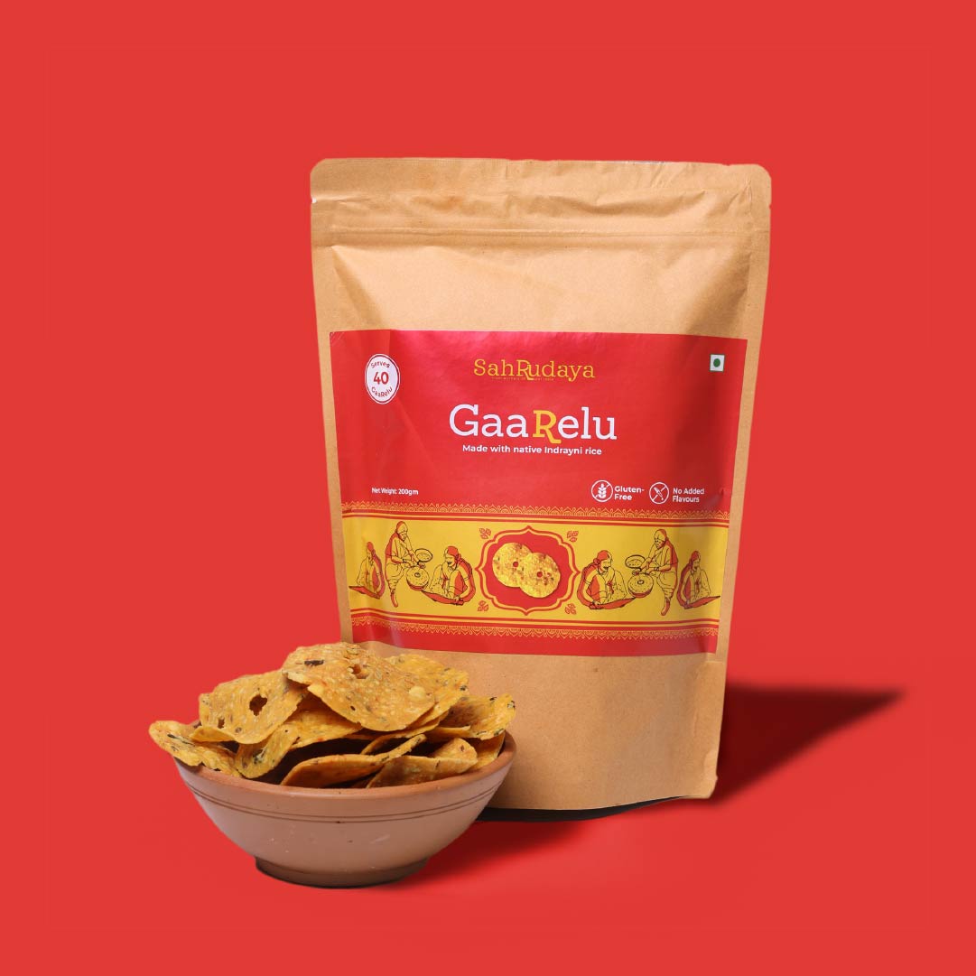 At Sahrudaya, we make GaaRelu using a traditional recipe paired with Indrayni rice, a fragrant native variety from Maval Taluka. These chips are naturally gluten-free, handcrafted from unpolished rice and lentils, and fried once in fresh sunflower oil (never reused).