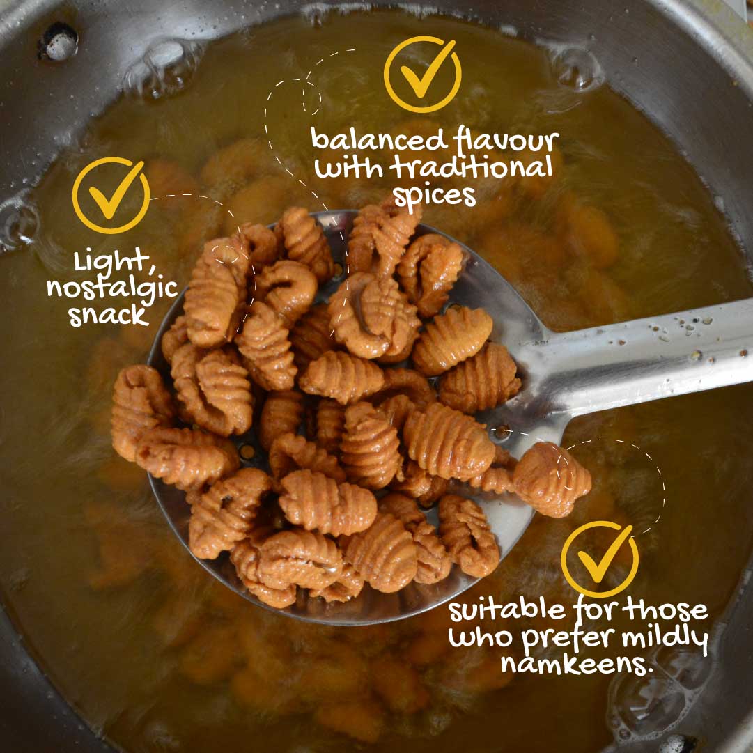 Light, nostalgic snack, balanced flavour with traditional spices; suitable for those who prefer mildly namkeens