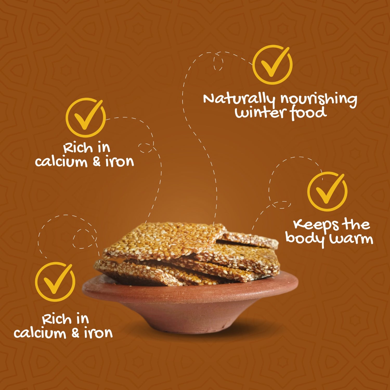 Every batch is made using unpolished sesame seeds sourced directly from farmers, pure organic jaggery, and desi ghee, cooked carefully in clean iron vessels to retain taste and nutrition. No chemicals. No preservatives. No refined sugar.