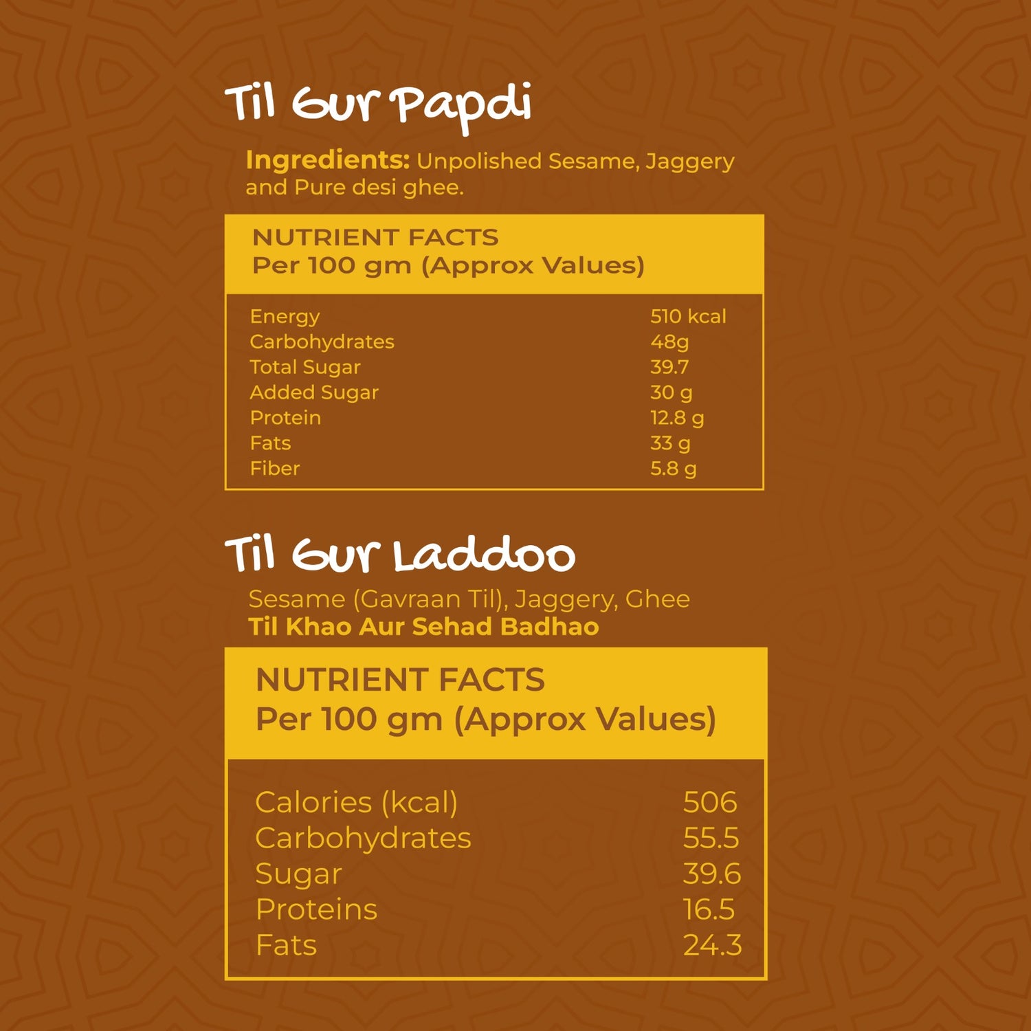Our Sankranti Til GuR Hamper includes handmade Til GuR Ladoos and crunchy Til GuR Pappadi, prepared exactly the way it was done in our villages — slow, mindful, and without shortcuts.